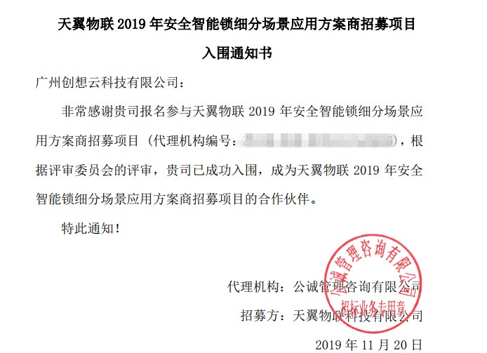 近日,天翼物聯(lián)科技有限公司 天翼物聯(lián)2019年安全智能鎖細(xì)分場景應(yīng)用方案招募項(xiàng)目評(píng)選結(jié)果揭曉,根據(jù)評(píng)審委員會(huì)的評(píng)審,創(chuàng)想云科技提交的基站智能門禁解決方案成功入圍天翼物聯(lián)科技有限公司安全智能鎖細(xì)分場景應(yīng)用方案庫。